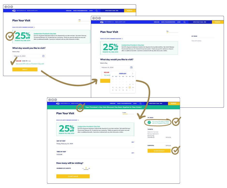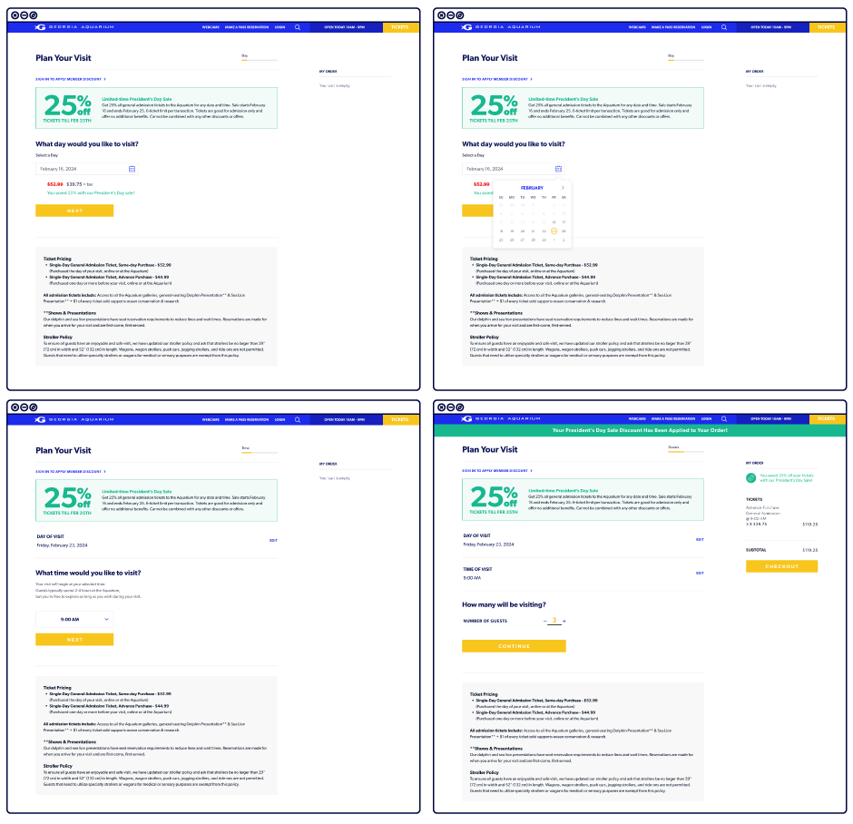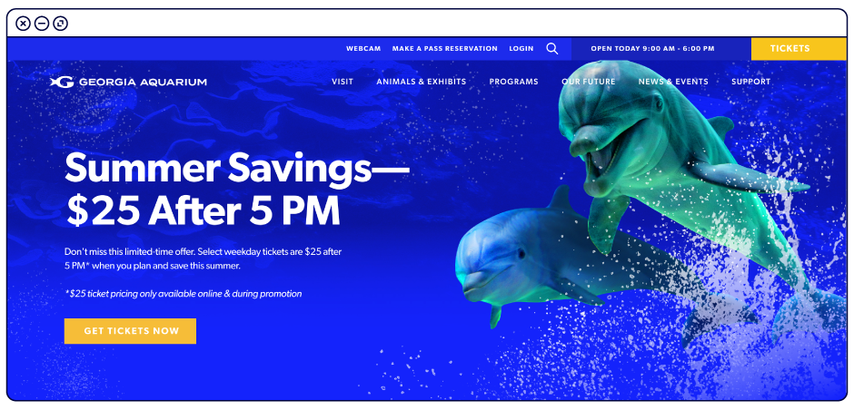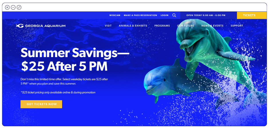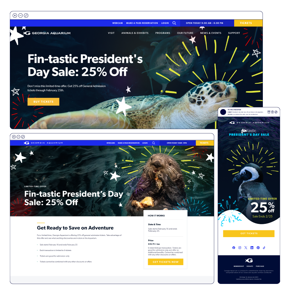With over 3 million visitors a year, Georgia Aquarium regularly promotes online seasonal campaigns to incentivize new and returning visitors, drive ticket sales, and increase membership growth. Each campaign includes creative assets and messaging integrated throughout the site, customized ticket flows, and targeted email campaigns.