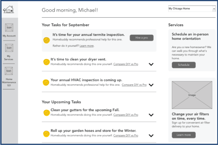 Timely reminders on the homepage with a prioritized task list which will allow users to be a part of keeping up with their maintenance through our Every home is unique design principle.